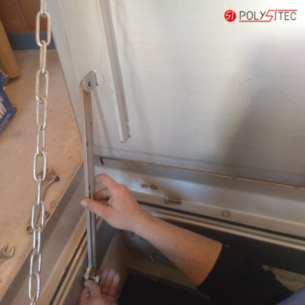 – Quitar los tornillos Allen de cierre, roscar los asideros, abrir la bandeja y si procede montar la palanca de seguridad anti-caida de enclavado automático, para ello debe moverse libremente. Instalar los pistones a gas con el cuerpo del cilindro en la bandeja rellenable y ajustar las cadenas para que actúen como tope de apertura y anti-vuelco. Verificar el correcto funcionamiento mecánico de todo el conjunto y la estanqueidad con los tornillos Allen de cierre apretados, no es necesario apretar muy fuerte.