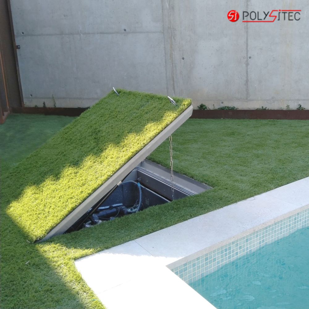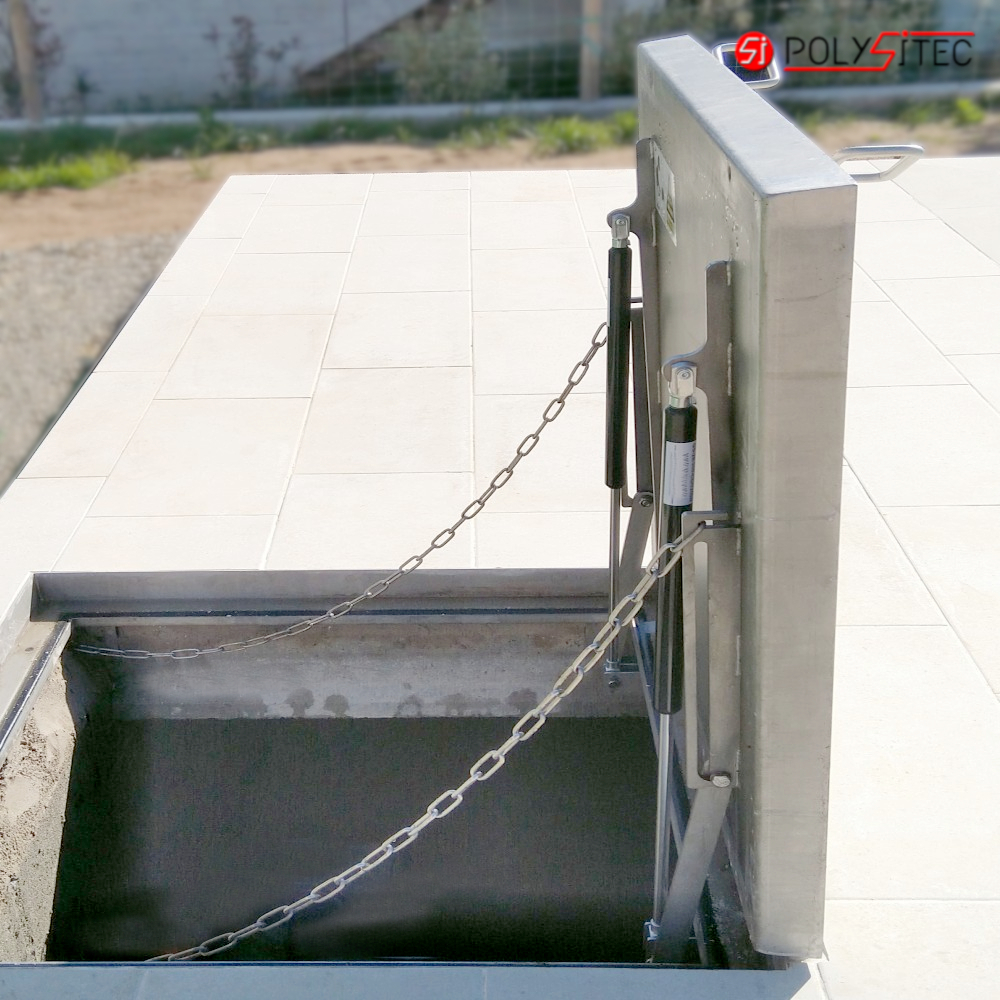 Polysitec® y su entorno les pueden aportar productos fabricados con acero inoxidable AISI 316L para las piscinas: escaleras verticales extensibles, canales de ranura slotdrain, rejas, canalinas, sumideros y TAPAS ASISTIDAS Premium con pistones de gas a presión, abisagradas, estancas y rellenables, para enrasar con el mismo tipo de pavimento circundante, aportando estética y funcionalidad. Para el acceso a subterráneos y depuradoras de piscinas en casetas enterradas.