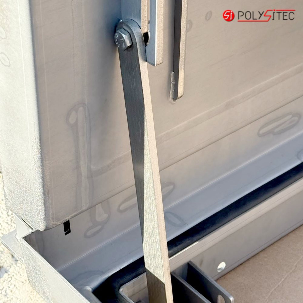 – Conjunto de Tapa de acceso asistida, rellenable y estanca, modelo Polysitec® K10x10 Premium para tránsito Peatonal K3, fabricado con chapa de acero Inoxidable AISI 316L de 3 mm. de espesor. | Con marco de chapa plegada de medida interior de 1.000×1.000 mm. y altura de 170/65 mm, con junta tórica de estanqueidad alojada en el pliegue del marco. | Con bandeja rellenable de altura de relleno 58 mm, con anclajes para el mallazo de acero y con bisagras reforzadas y atornilladas en el marco. | Con posterior decapado y pasivado por inmersión de todo el conjunto. | Con tornillos M10 (DIN 912) y 2 asideros Inox de M12. | Con cadenas antivuelco y palancas de seguridad anticaída autobloqueables, todo en acero Inox 316L. | Con anclajes para 3 pistones de gas a presión y 2 pistones de acero galvanizado o pintado con la fuerza (N) acorde al peso del material de relleno usado.