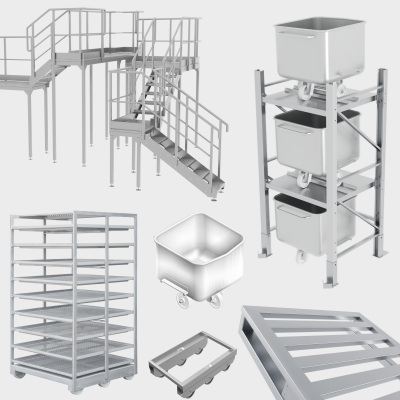 Polysitec® y su entorno les puede aportar equipamiento industrial fabricado con acero inoxidable AISI 304 o 316L, con posterior decapado y pasivado: Bases rodantes y carros inox para eurocaja de 600×400, carros y carretillas con ganchos o barras, para hornos de cocción, ahumados y almacenaje. Depósitos de 150L, 200L y 300L con ruedas de Nylon. Drenaje y canalizaciones para pavimento industrial con loseta cerámica vitrificada antiácido o suelos continuos con resina de metracrilato PMMA, epoxy, etc. Tapas Rellenables estancas hasta D400 para transito pesado, con junta tórica y tuercas flotantes. Baldosas antideslizantes o lisas y juntas de dilatación sinusoidales, en espiral o en zig-zag, con o sin junta plástica. Sumideros estancos, sumideros industriales sifónicos con el cestillo para la recogida de sólidos. Canales y canalinas con los accesorios para la instalación / unión en tramos con tornillos de acero Inoxidable y juntas. “Asesoramiento, ingeniería, certificación alimentaria, cotización, fabricación, facturación y garantías directo de fábrica”